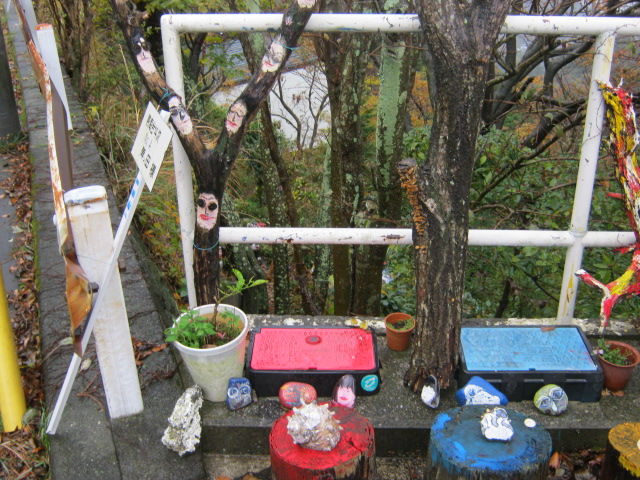 枝や石に、ブキミな顔が描かれています。とてもカラフルです。