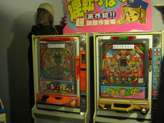 昔のパチンコ台を紹介するコーナーなんだけど、上に立てられてるのは、なぜか「電車でGO!」のポップ。しかも、ご丁寧に、ババアの生首まで置かれてます。