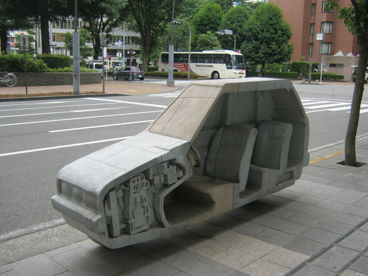 | 立川駅目の前、1周20分ぐらいの小さな区画には、なんと109個ものパブリックアート作品が置かれてます。 歩道のわき、茂みの中、ビルの陰‥ありとあらゆる場所に作品が潜んでいる光景は、さながらアートのポケモン状態。「パブアト(パブリックアートの略)、ゲットだぜ!」 世間が、高橋容疑者探しに励むなか、わたくしは、アートを探してまいりました。 |