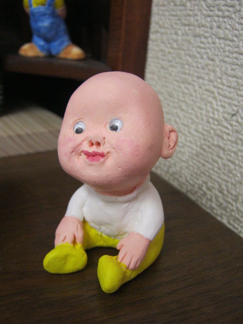 粘土で形を作り、アクリル絵の具でカラーをつけて、指人形の完成。