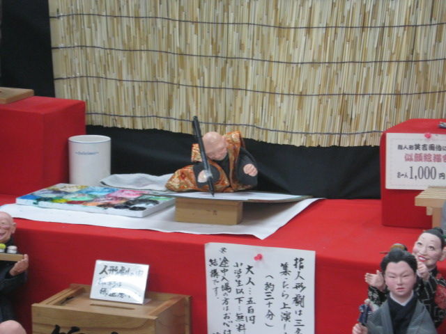 ひな壇中央をご注目ください。指人形が、なにやら絵を描いてますね。そう、1000円を払うと、お客さんの似顔絵を描いてくれます。キーポイントは1000円です。