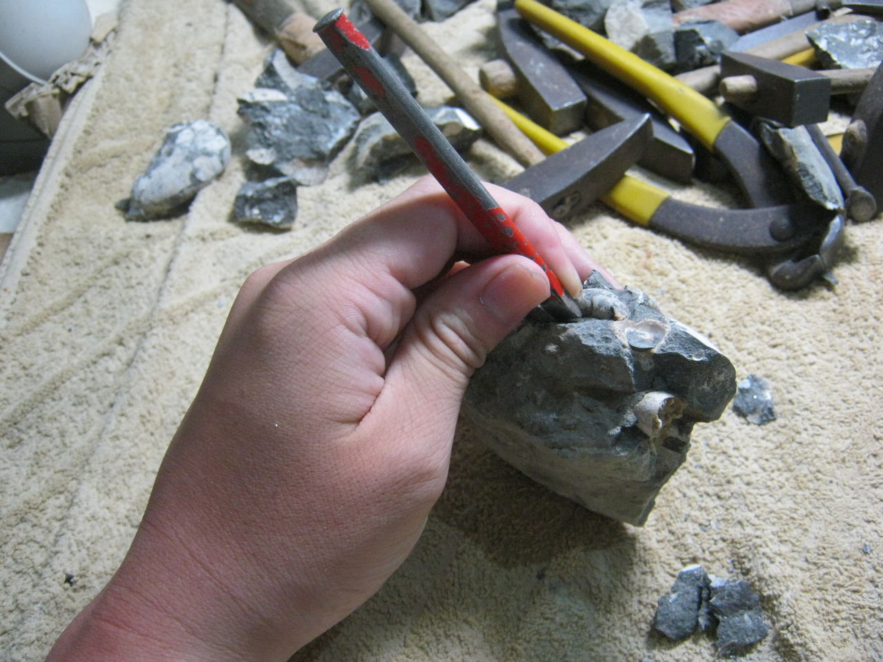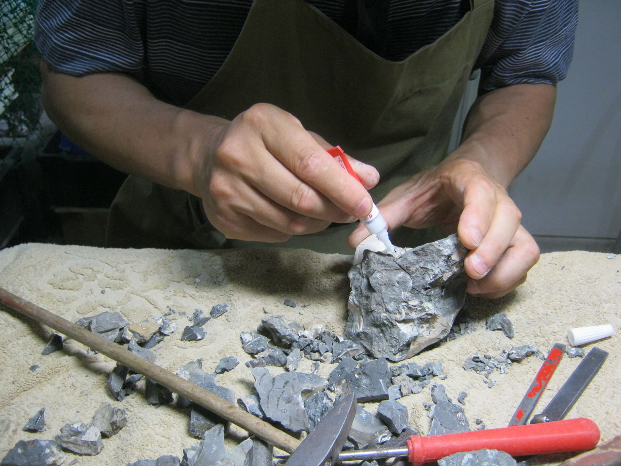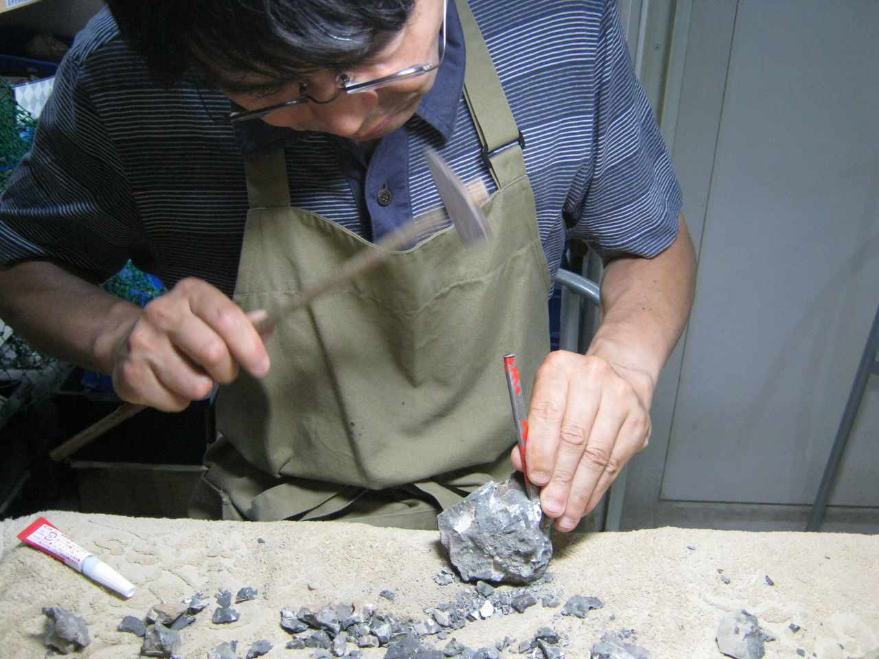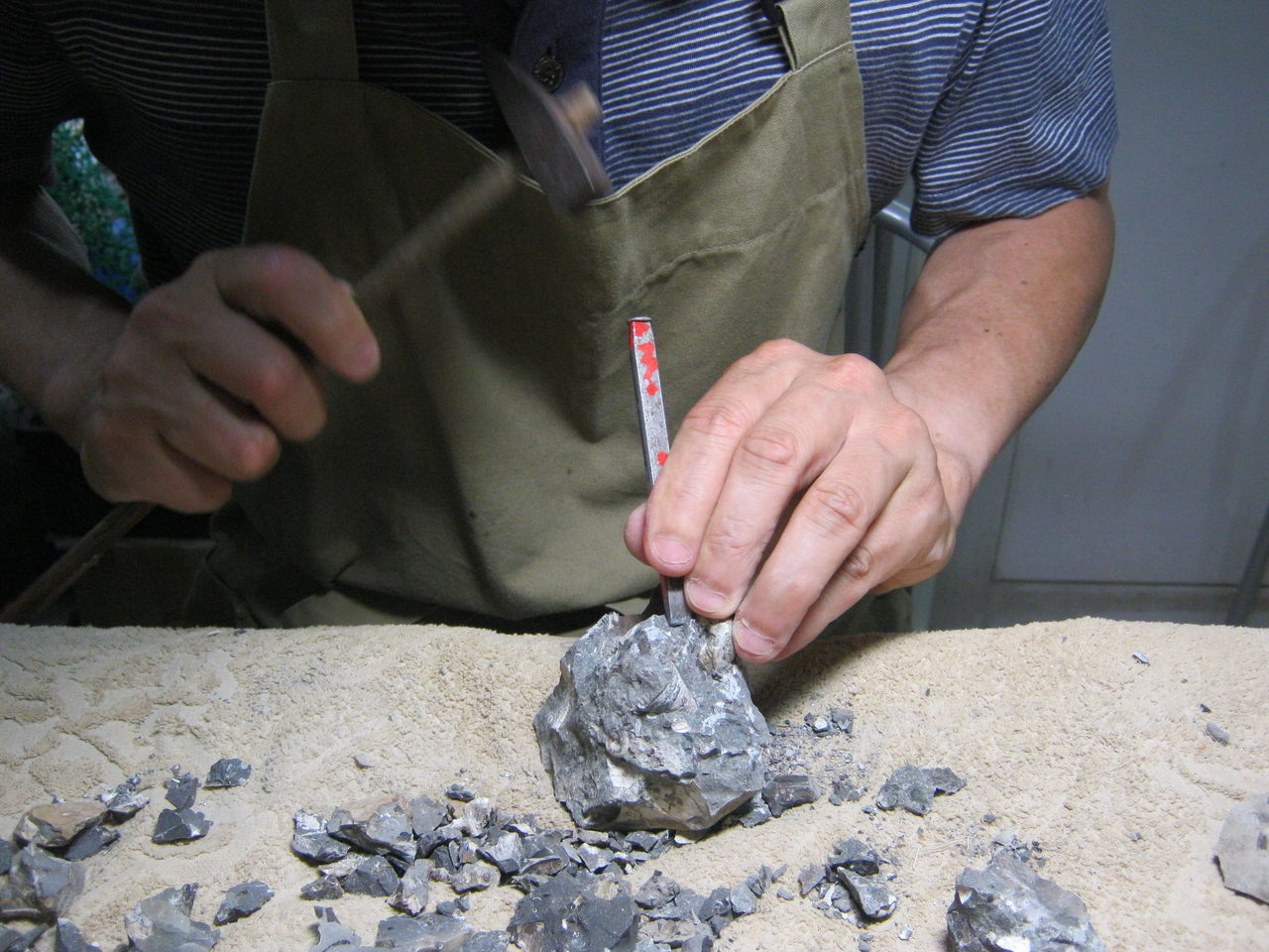 「あんまりアンモナイトの近くを叩くと壊れちゃうから、遠くから削りおとす感覚で」