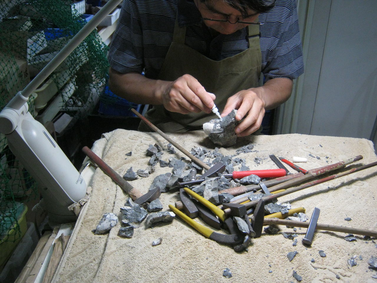 奥で、化石を削ってるらしい。