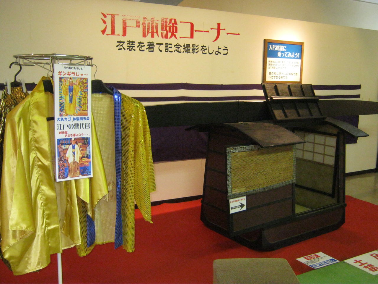 それっぽい衣装に着替えて、大名かごに乗ったり、肥え桶をかついだりします。