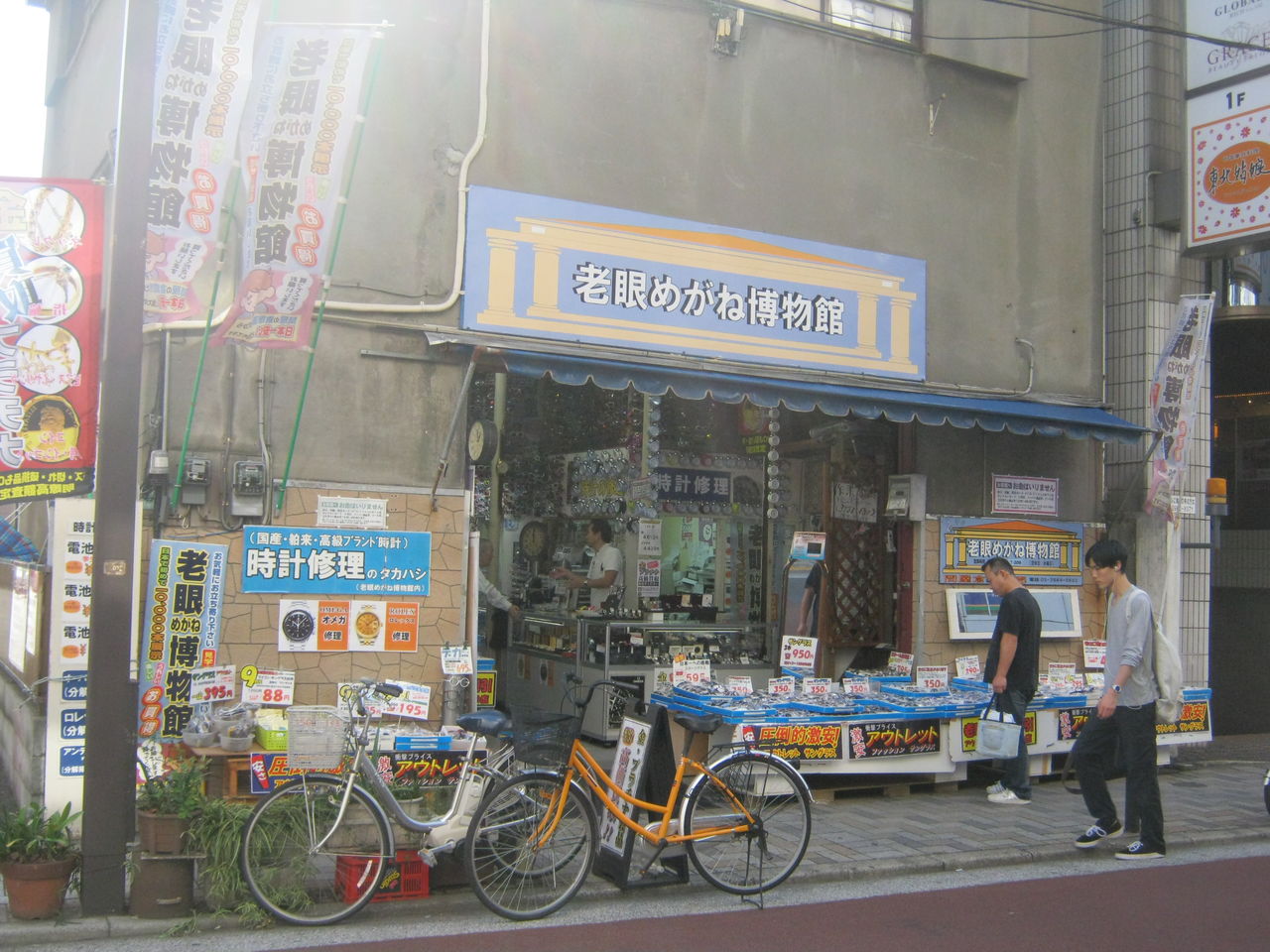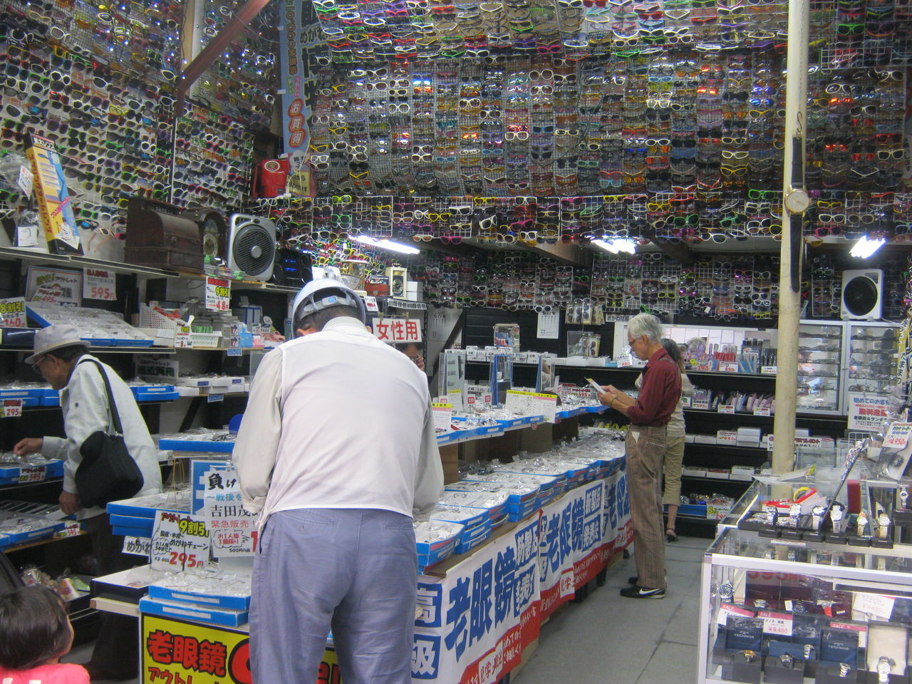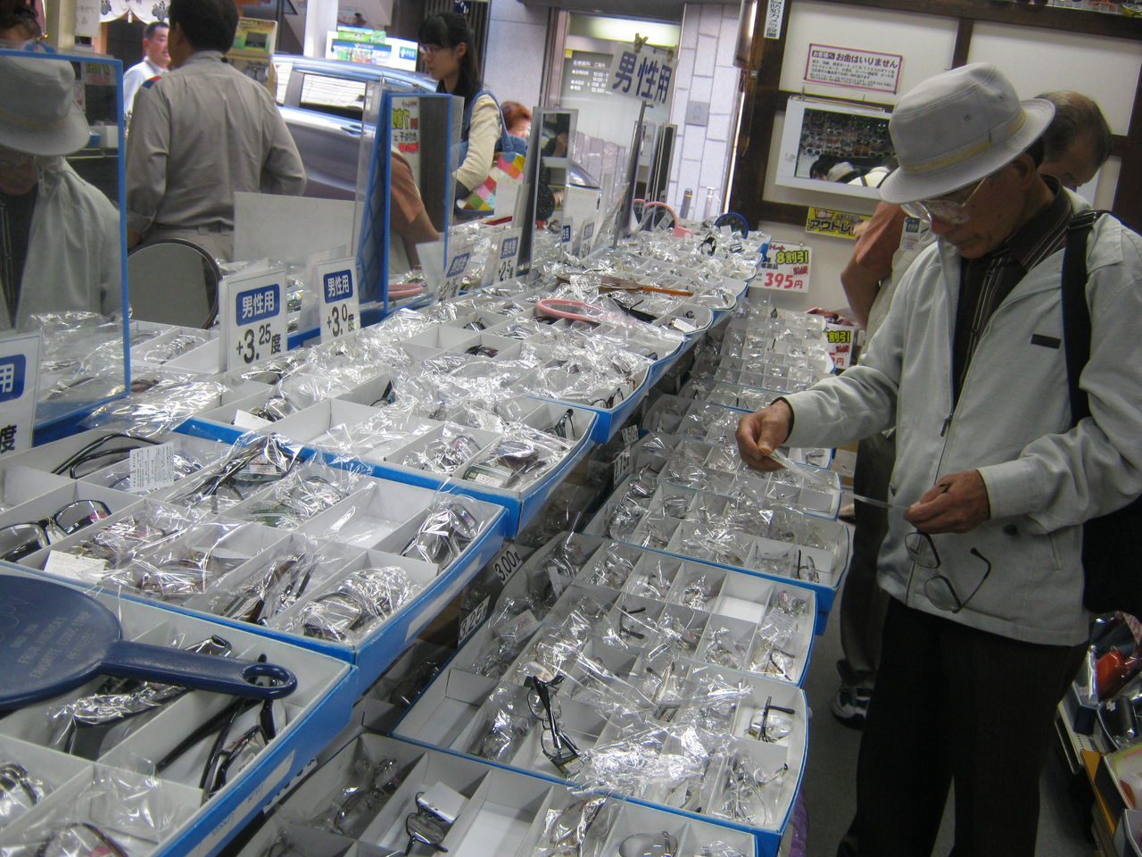 平日昼間に行ったんだけど、店内はおじいちゃん、おばあちゃんで賑わってました。巣鴨に劣らぬ人気スポット。とげぬき地蔵よろしく、老眼鏡をじっくり触って、吟味してます。
