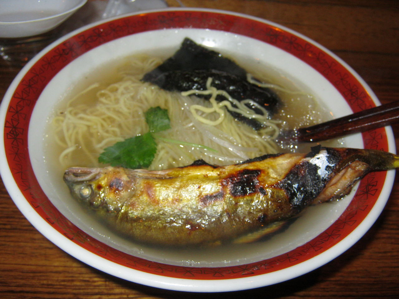 | 二子玉川駅にあるラーメン屋。 スープのダシを鮎からとって、さらに、トッピングとして鮎がまるごと乗っかってる一品。 ラーメンと鮎って珍しい取り合わせですよね。 |