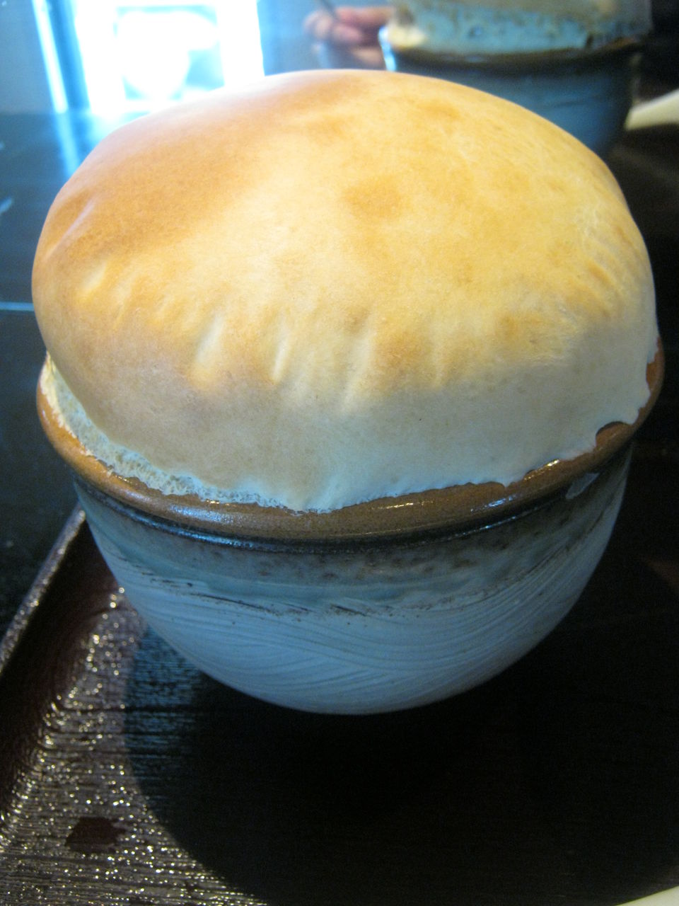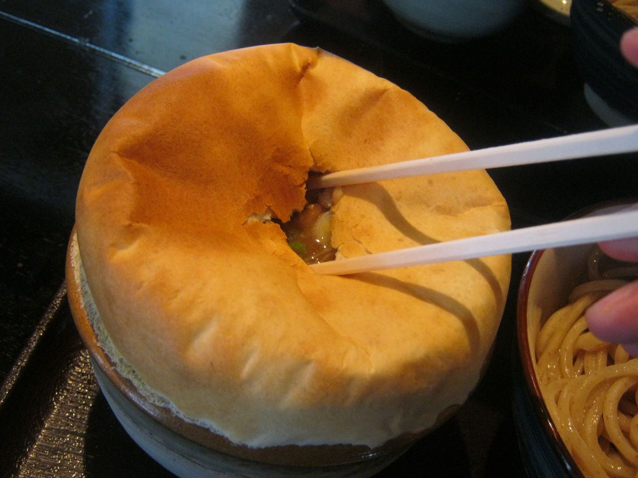 うーん、つけ汁がふっくらとパイ生地で覆われてて、カワイクも面妖なビジュアル。