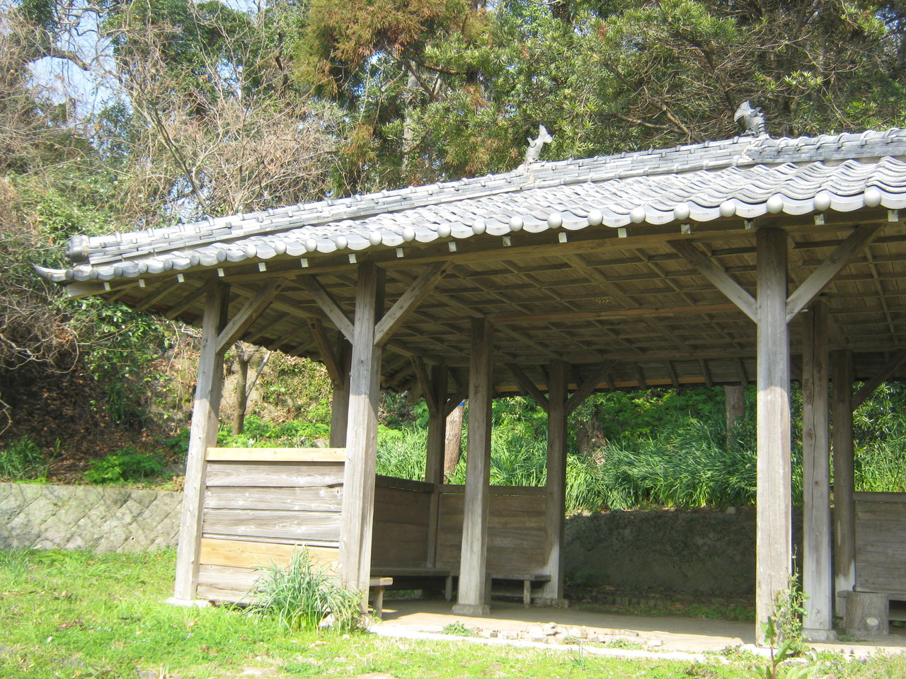 ▲年季の入った休憩所。屋根のうえにはシャチホコのようなオブジェも。