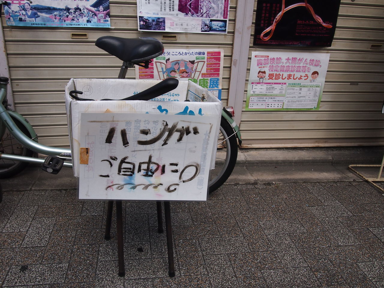 カエルの横には、自由に持ち帰ってよいハンガーも。キャップといい、てんぷら油といい、ここんちの妖怪はエコ意識が高い。