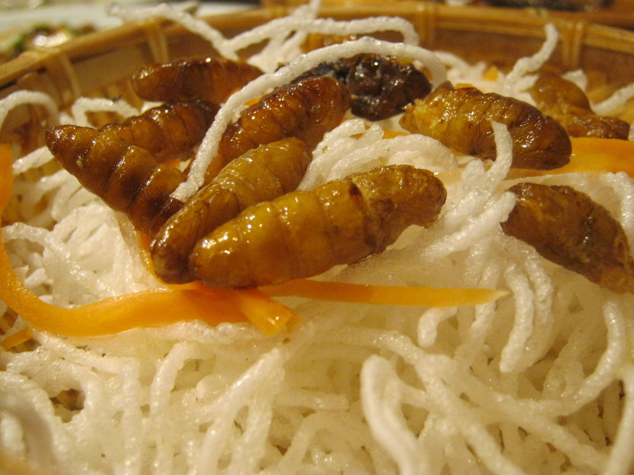 とにかくラインナップがすごくって、「ザリガニの甘煮」「サソリのから揚げ」「蜂の幼虫のから揚げ」とか珍しいのがごっそり。むちゃくちゃ臭い「臭豆腐」って料理も、ぜひ食べて欲しいな。
