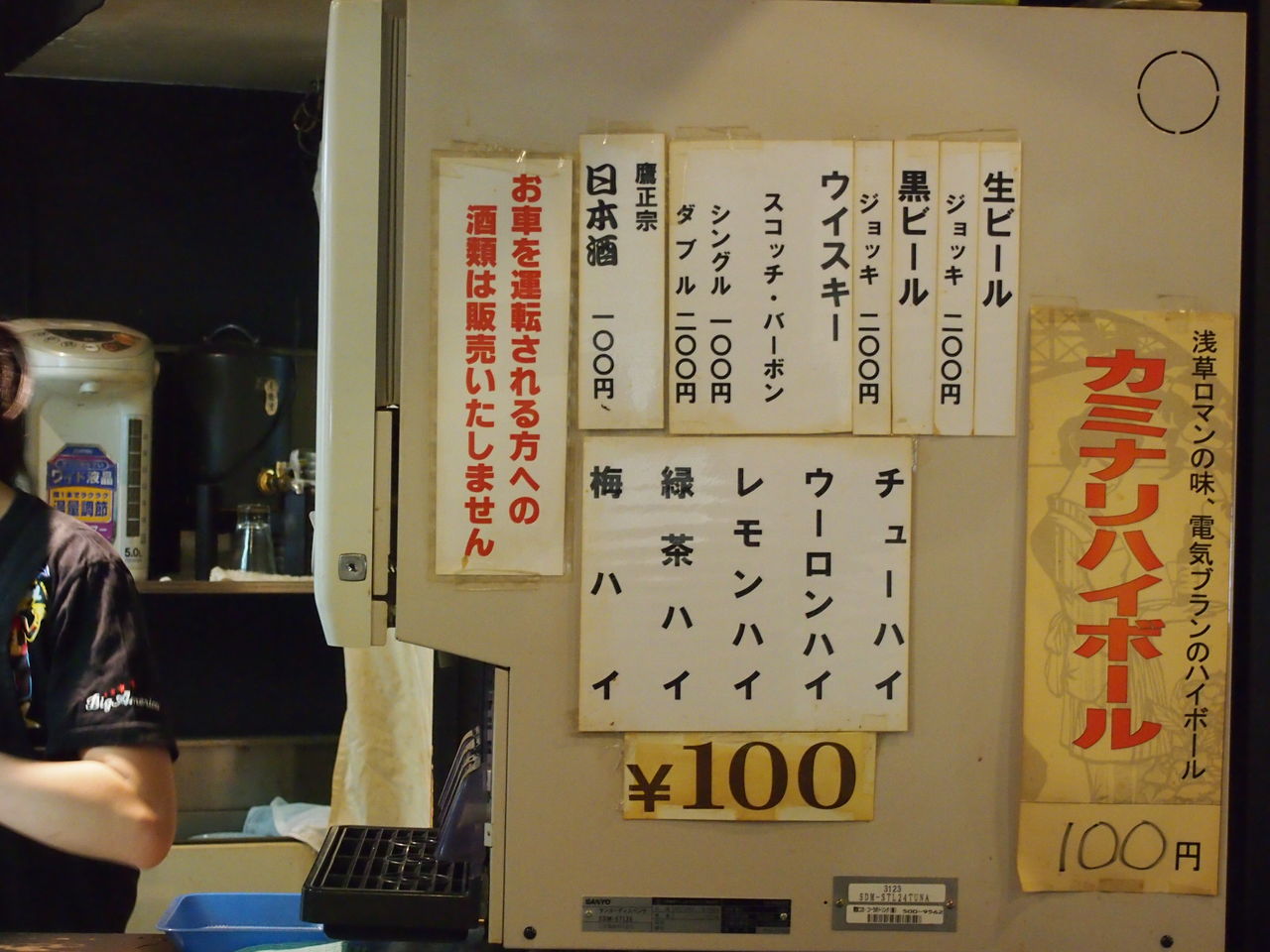 店内のいたるところに「衛生上、一度とったオカズは戻さないでください」って書かれてたけど、そんなに「あ、やっぱやめた」って戻しちゃう人が続出してるのだろうか。100円で飲む人の金銭感覚は研ぎ澄まされているのだなあ。